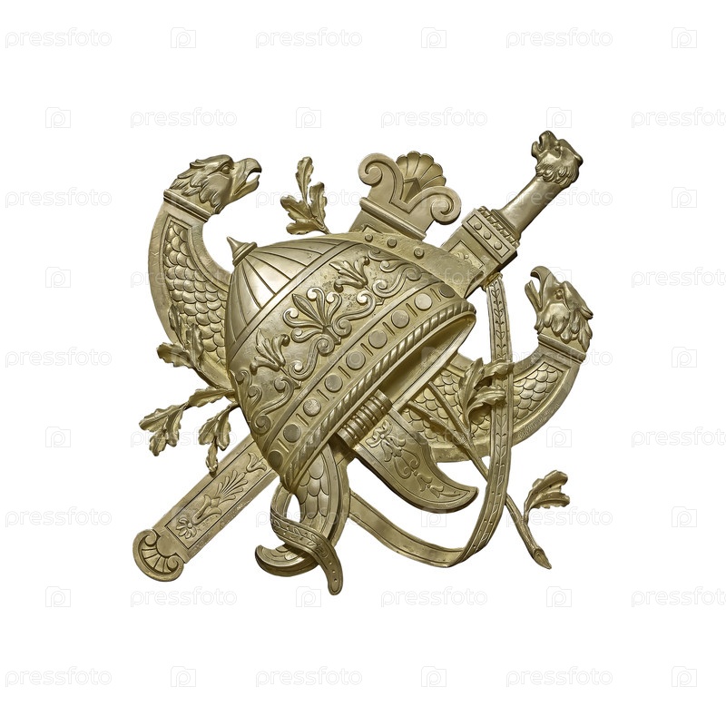 Золотой декоративный элемент интерьера с изображением шлема из древнегреческого мифа для создания плаката, афиши, баннера