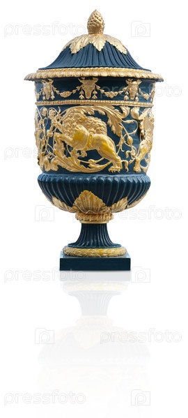 Декоративная бронзовая ваза с золотыми античными ювелирными изделиями на белом фоне. элемент дизайна с контуром офорта