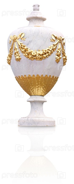 Древняя декоративная мраморная ваза с золотым цветочным украшением изолирована на белом фоне