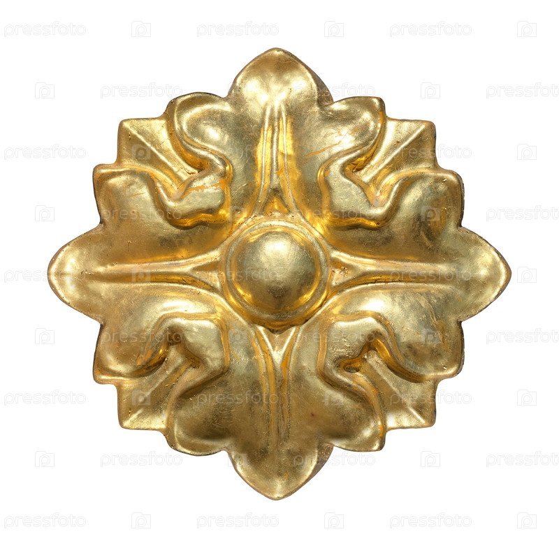 Круглый золотой декоративный элемент с цветочным узором выделен на белом фоне