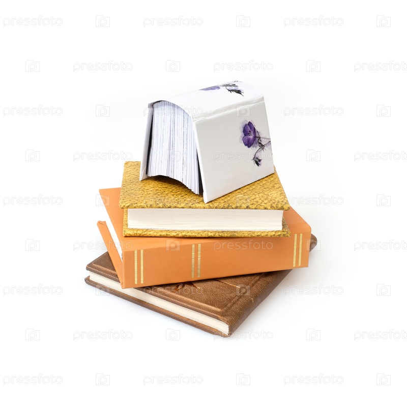 Куча книг в цветных обложках с белыми листами, изолированными на белом фоне