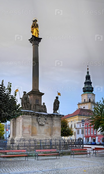 Марианская колонна чумы в Чешской Республике, памятник барокко со статуей Девы Марии, мрачная погода, Чехия