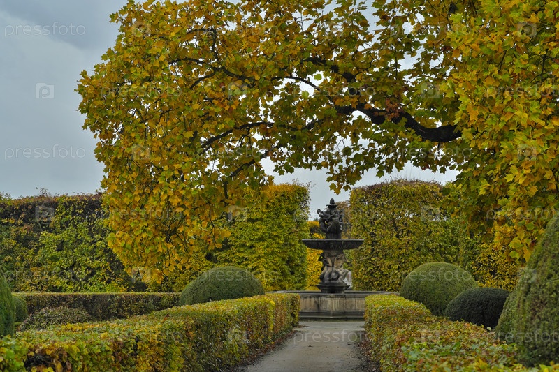 Осенняя аллея, ведущая к фонтану в саду замка в Кромризе, Чехия