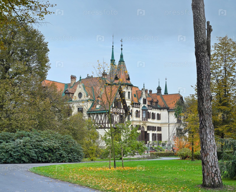 Осенний вид на замок Лешна (Zámek Lešná), романтическая архитектура XIX века, сочетающая в себе неоготический, ренессансный и швейцарский стили, Чехия