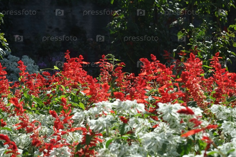 Красная сальвия (красный шалфей) и Euphorbia marginata (молочный дуб). естественный изолированный фон в ботаническом саду
