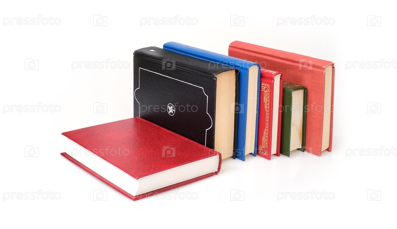 Куча книг в цветных обложках с белыми листами, изолированными на белом фоне