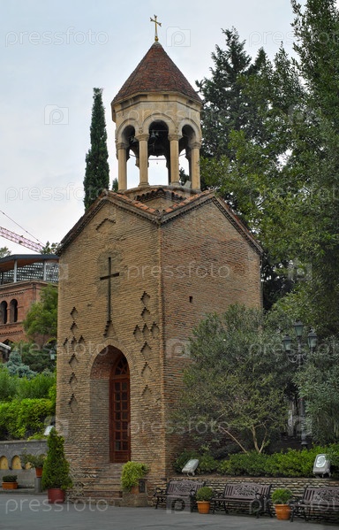 Старая колокольня Сионского собора, Тбилиси (Грузия), архитектура из терракотовых кирпичей с каменными арками и крестами, окруженная пышной зеленью