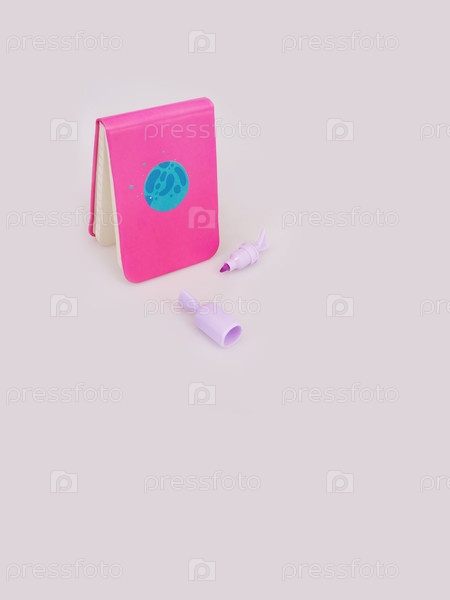 Композиция (мокап) с розовым блокнотом и многоцветными маркерами, подчеркнутыми на белом фоне