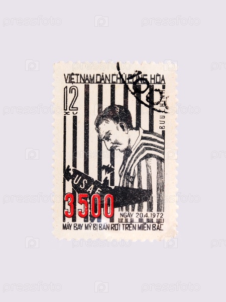 Вьетнамская почтовая марка 'Пилот заключенный' из 3500 сбитого американского самолета, изолированного на белом фоне