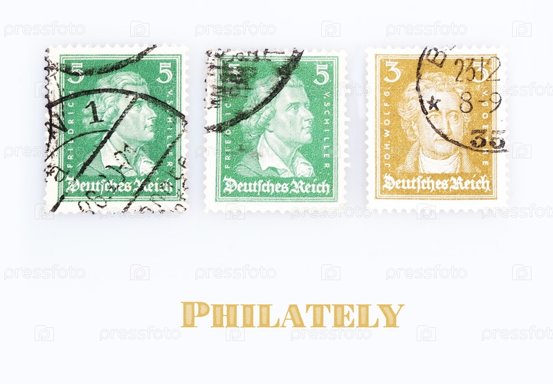 Немецкие почтовые марки изолированы на белом фоне портретами поэтов Гёте и Шиллера