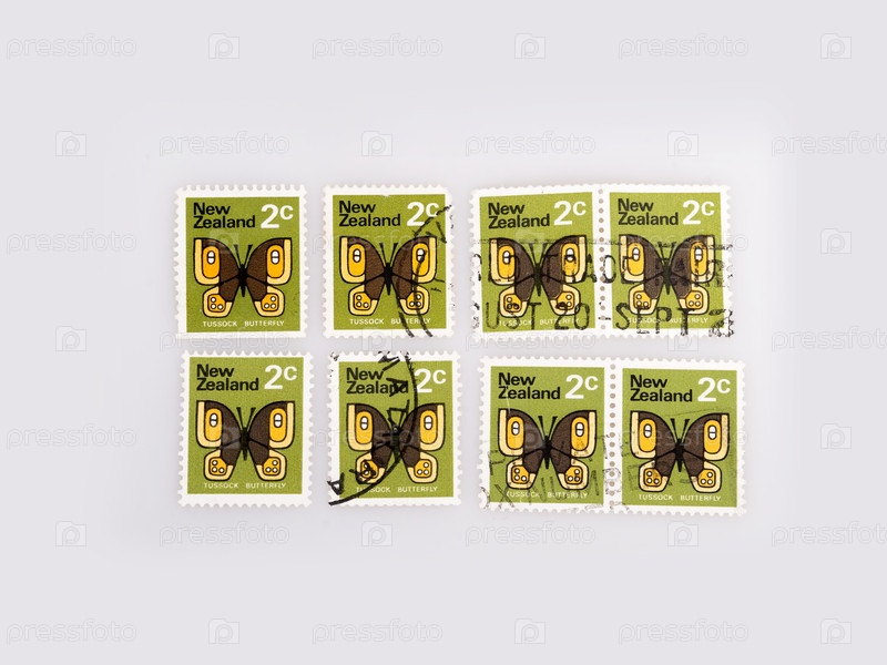 На фоне ярких почтовых марок Новой Зеландии изображен мотылёк