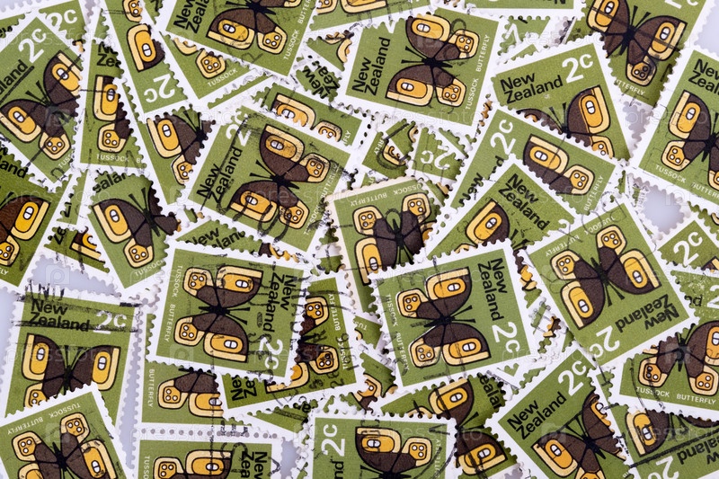 На фоне ярких почтовых марок Новой Зеландии изображен мотылёк