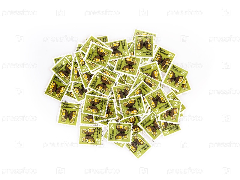 На фоне ярких почтовых марок Новой Зеландии изображен мотылёк