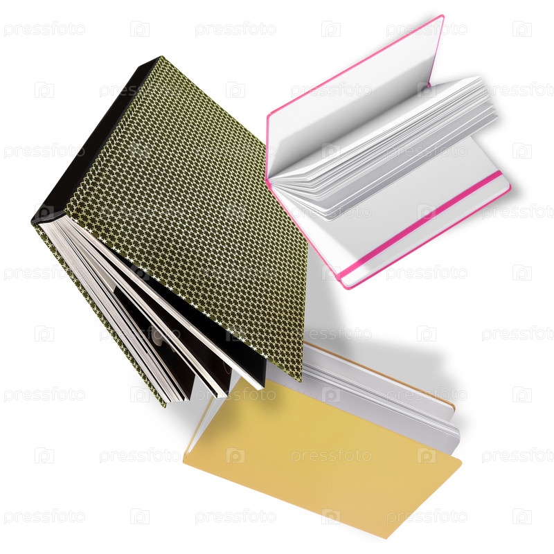Летающие книги в цветных обложках с белыми листами, изолированными на белом фоне