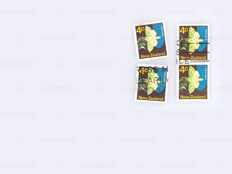 На фоне ярких почтовых марок Новой Зеландии изображена мотылёк пурири