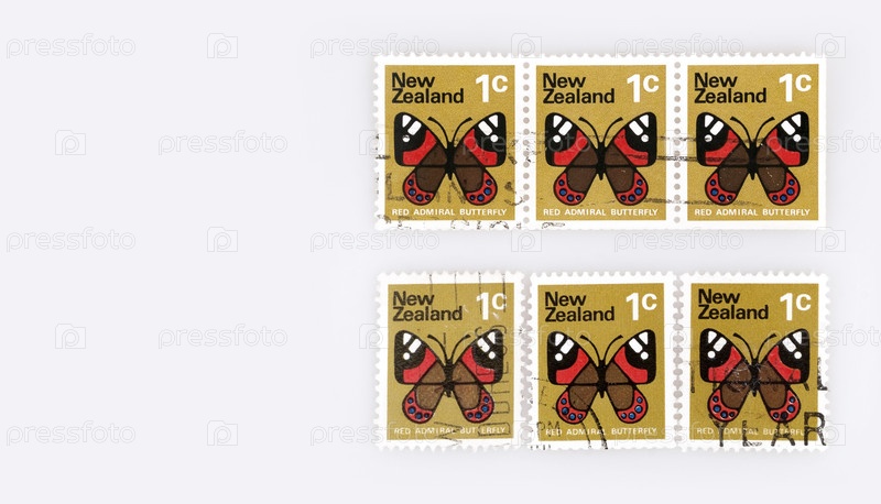 Яркие почтовые марки Новой Зеландии с изображением красной адмиралтейской бабочки