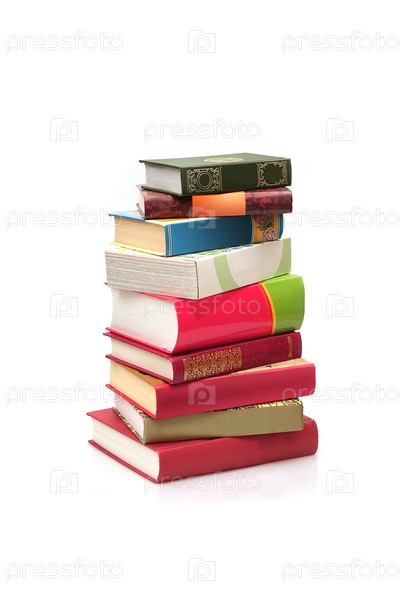 Куча книг в цветных обложках с белыми листами, изолированными на белом фоне