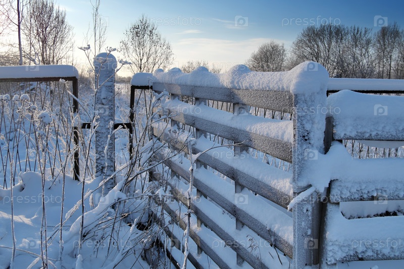 Закрытие снежного деревянного забора с замороженными растениями зимой