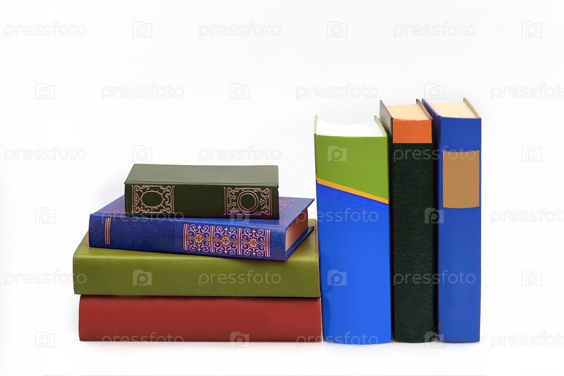 Куча книг в цветных обложках с белыми листами, изолированными на белом фоне