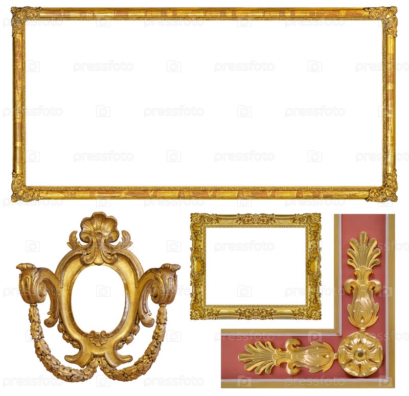 Золотые рамы для картин, зеркал или фотографий, изолированных на белом фоне (множество изображений)
