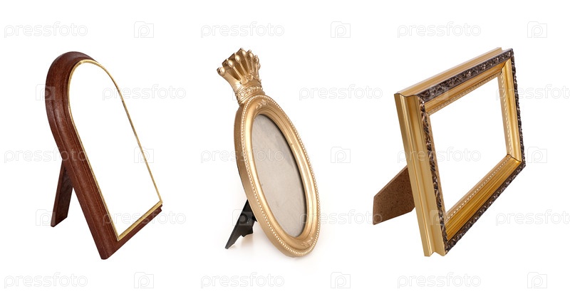 Набор золотых рамок для картин, зеркал или фотографий изолирован в перспективе на белом фоне