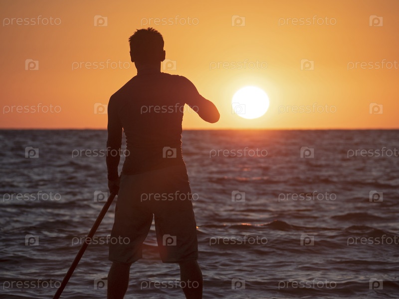 Силуэт активного мужчины, гребящего с веслом на SUP посреди солнца