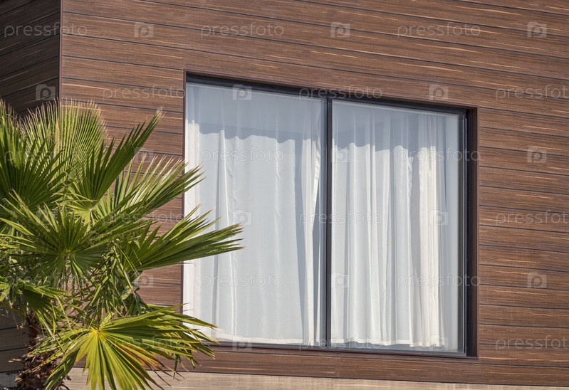 Деревянный фасад дома с окном с белыми шторами