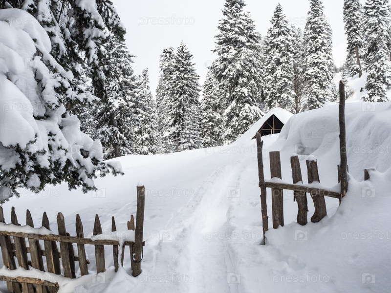 Зимний сельский ландшафт со снежными деревьями и деревянным забором