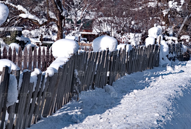 Вид на деревянный забор в перспективе в снежном селе Кебесен, Россия