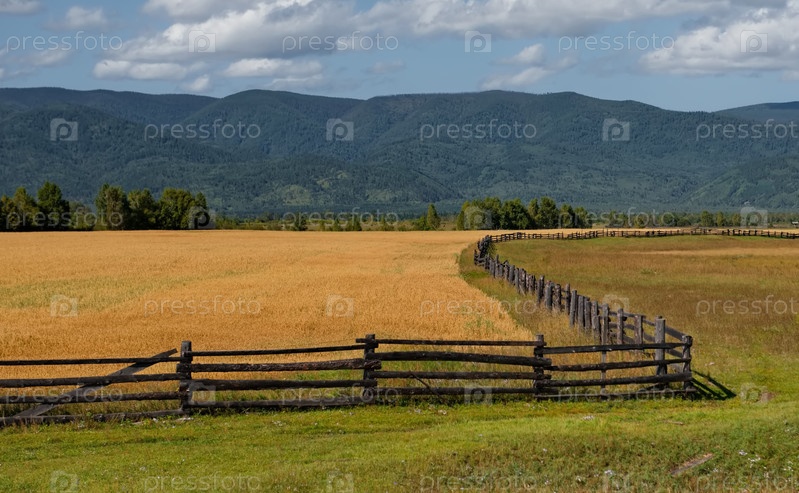 Вид на поля в долине реки Иркут, огороженные деревянными заборами специальной зигзаговой структуры из бревен