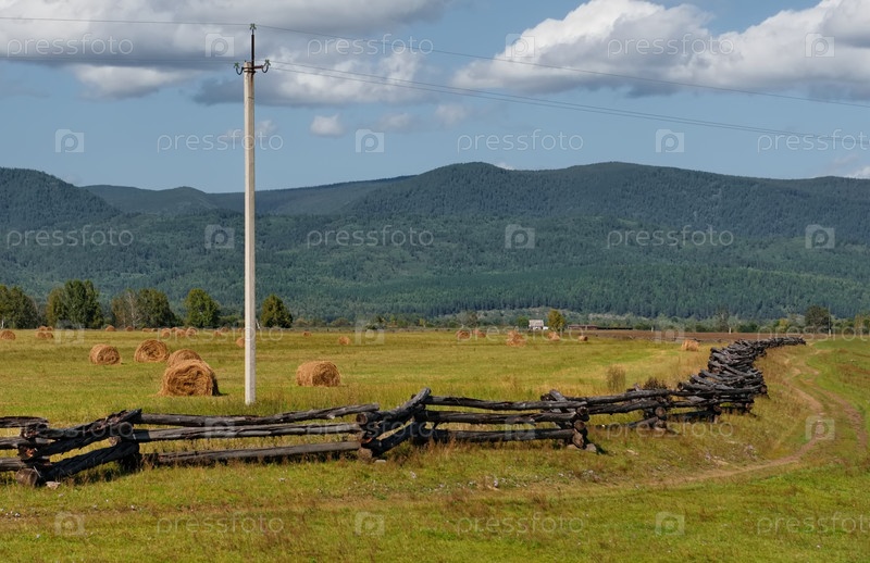 Вид на поля в долине реки Иркут, огороженные деревянными заборами специальной зигзаговой структуры из бревен