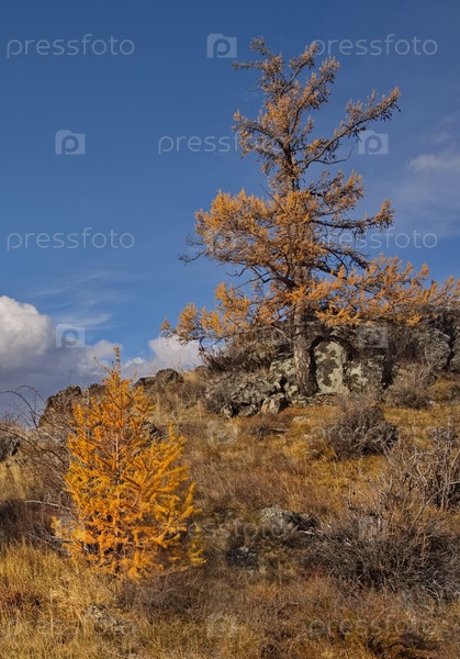 Юг Западной Сибири, Алтайские горы. Вид на одинокую личинку в желтой осенней одежде на живописных скалистых местах в курайской степи вдоль Чуйского тракта