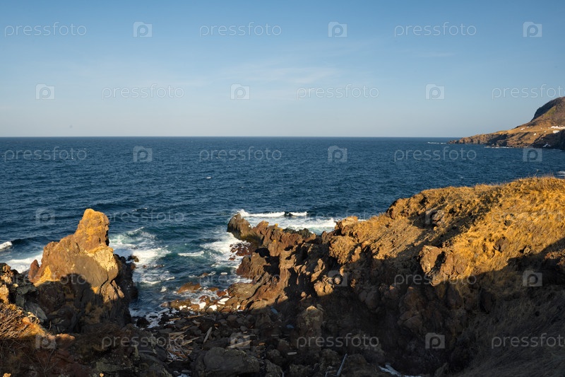Дальний Восток. Курильские острова. Волны Тихого океана врезаются в базальтовые породы на берегу острова Итуруп