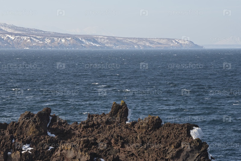 Дальний Восток. Курильские острова. Волны Тихого океана врезаются в базальтовые породы на берегу острова Итуруп