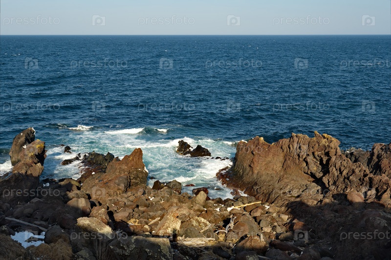 Дальний Восток. Курильские острова. Волны Тихого океана врезаются в базальтовые породы на берегу острова Итуруп