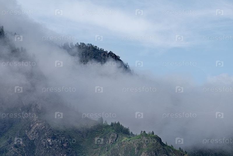 Юг Западной Сибири, горы Алтай.Утренний морозный туман на вершинах гор тайги вдоль Чуйского тракта в долине реки Чуя