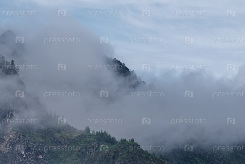Юг Западной Сибири, горы Алтай.Утренний морозный туман на вершинах гор тайги вдоль Чуйского тракта в долине реки Чуя