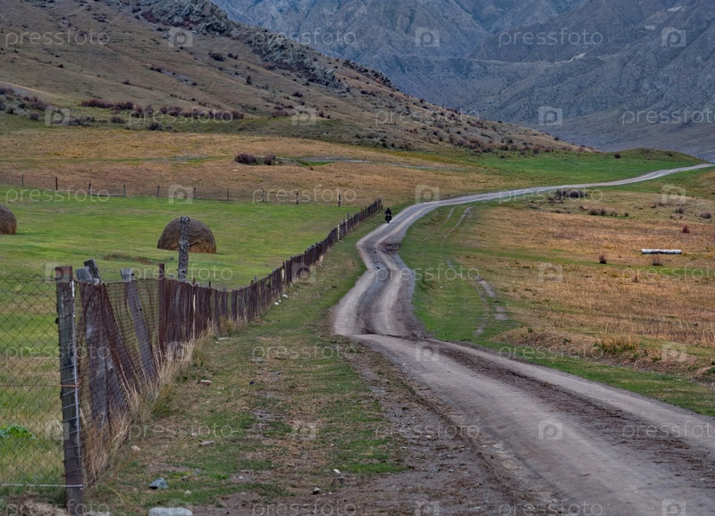 Юг Западной Сибири, горы Алтай. грунтовая дорога, простирающаяся на расстояние вдоль деревянного забора, окружающего летние пастбища