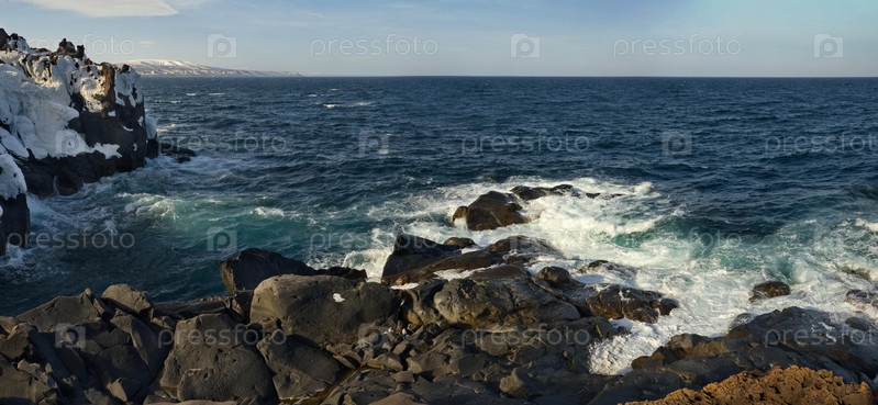 Дальний Восток. Курильские острова. Волны Тихого океана врезаются в базальтовые породы на берегу острова Итуруп