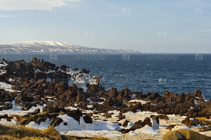 Дальний Восток. Курильские острова. Волны Тихого океана врезаются в базальтовые породы на берегу острова Итуруп
