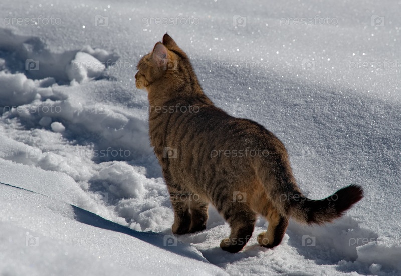Молодая тигровая кошка слушает молчание леса в весенний снег