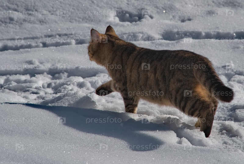 Молодая тигровая кошка слушает молчание леса в весенний снег