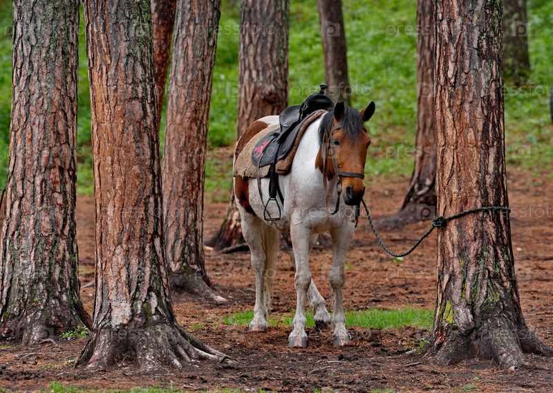 Юг Западной Сибири, Алтайские горы. Лошадь с седлом на поводке ждет туристов среди сосновых деревьев для верховой езды в Алтае