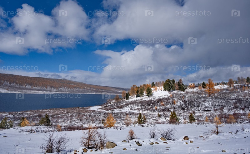 Осенний вид на озеро, высушенное первым снегом, по пути в Улаган