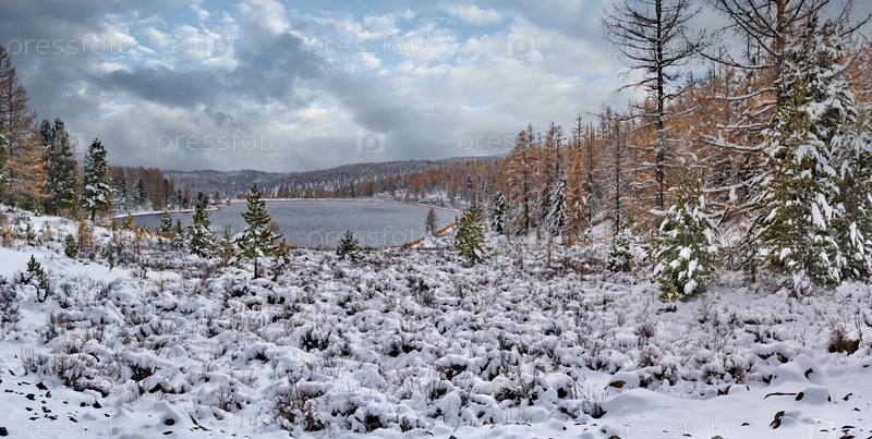 Осенний вид на озеро, высушенное первым снегом, по пути в Улаган