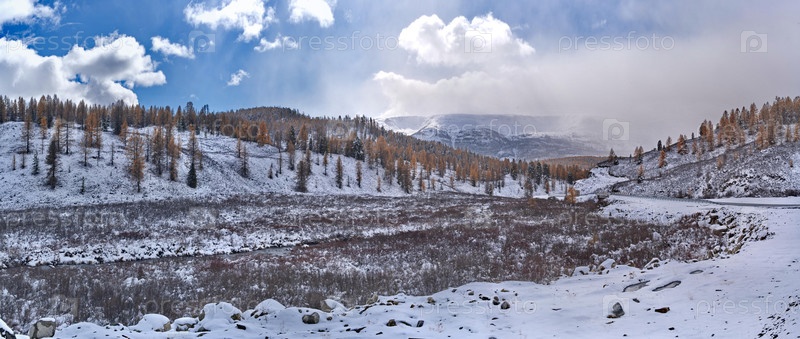 Юг Западной Сибири, Алтайские горы. завораживающий вид желтых личинки, порошкообразные первым осенним снегом вдоль Чуйского шоссе в долине реки Чуя