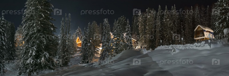 Йогач, Россия. 09 января 2026.Панорамный ночной вид на гостиницы туристической деревни в окружении заснеженных многовековых елей