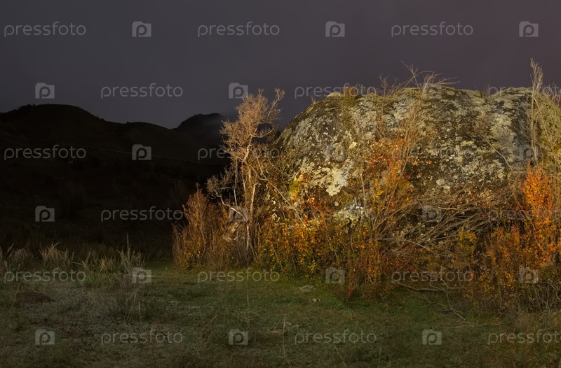 Юг Западной Сибири, Алтайские горы.Осенняя лунная ночь в каменной долине горной реки Катун недалеко от деревни Иния