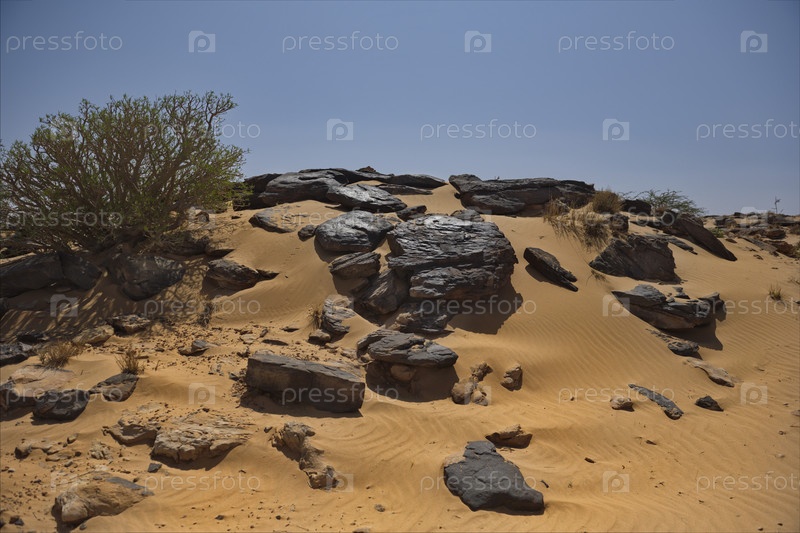 Скалистые фрагменты вулканического происхождения на скалистом плато Агропарка на юго-западном краю пустыни Сахара