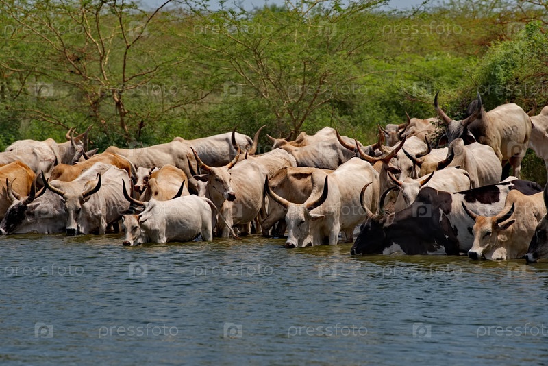 Стадо горбатых коров Зебу с огромными рогами пьет воду из небольшого озера на Атлантическом побережье